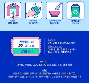 배달앱에서 2만원 이상 4번 이상 주문을 하면 만원 환급을 해준다고 합니다. 신청은 각 카드사에서 하면 되고, 요즘 이용가능한 대부분의 배달앱을 모두 이용할수 있습니다. 카드사하고 사용하는 배달앱이 있다면 한번 해보세요. 외식 자주 하신다면 잊지 말고 꼭 신청해 보시기 바랍니다.
