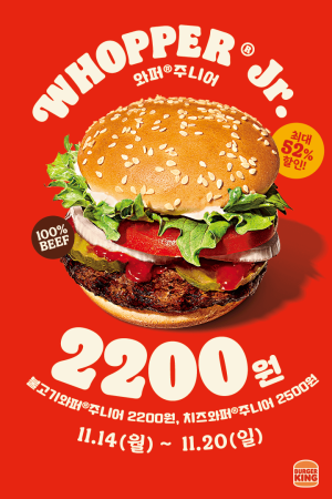 버거킹 와퍼주니어는 이벤트를 자주 하는거 같아요. 11월 14일 부터 11월 20일까지 와퍼주니어가 2200원 이라고 합니다. 버거킹 좋아 하신다면 이 기간동안에 많이 드시면 좋을거 같네요.. ㅎㅎ 1. 행사명 : 와퍼주니어 2,200원 2. 제품 : 와퍼주니어, 불고기와퍼주니어, 치즈와퍼주니어 (2,500원) 3. 행사 기간 : 22년 11월 14일(월) ~ 11월 20일(일), 7일간 4. 행사 시간 : 매장 운영시간에 따라 상이 합니다. 5. 유의 사항 *1인 5개까지만 판매 *다른 할인 및 쿠폰과 중복 혜택 불가…